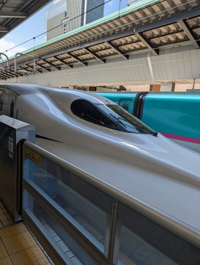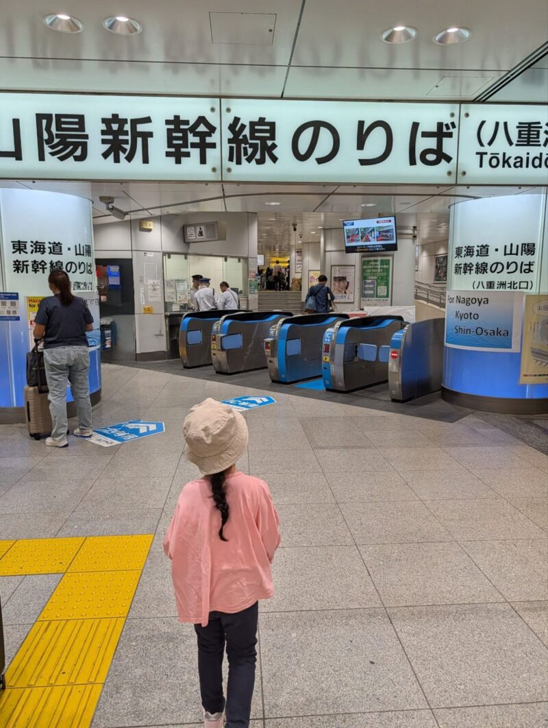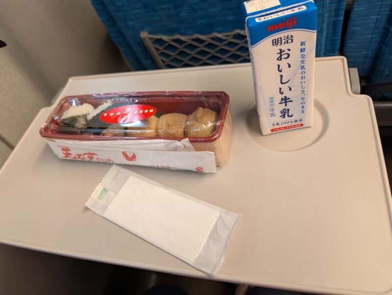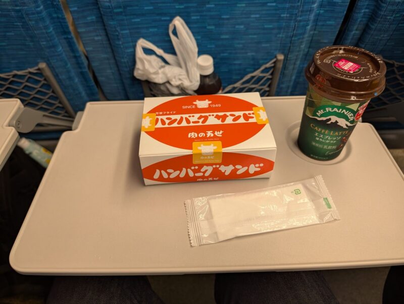 新幹線のお供としてかぼちゃパパは「肉の万世のハンバーグサンド」、娘ちゃんは「天むす・おいなりさんセット」を購入し、車内で仲良く朝ごはんを食べました。