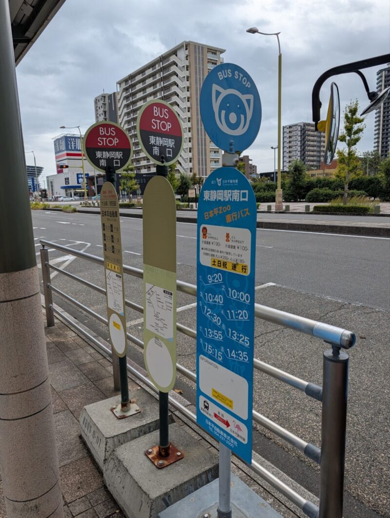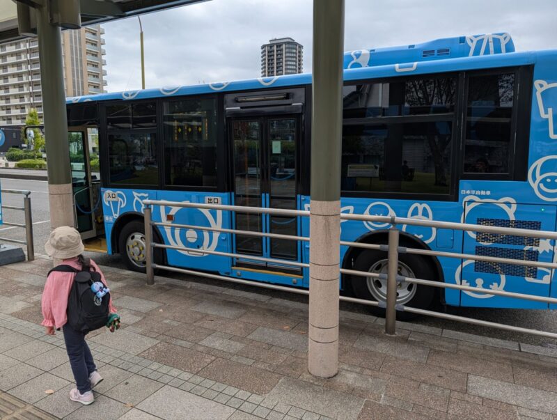 休日のみ運行している【動物園に行こう!線】に乗ります。バスは動物園モチーフでかわいいかったです。大人は往復チケット(350円)を購入しましたが、5歳の娘ちゃんは無料でした。