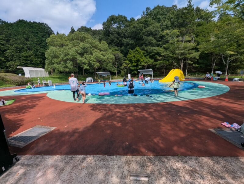 ようやく徒渉池に着きました。道中は人影を全く見かけませんでしたが、徒渉池にはたくさんの人がいました。徒渉池は水深も浅く、娘ちゃんにはピッタリの水場でした。奥の黄色いすべり台で何度もすべって遊んでいました。