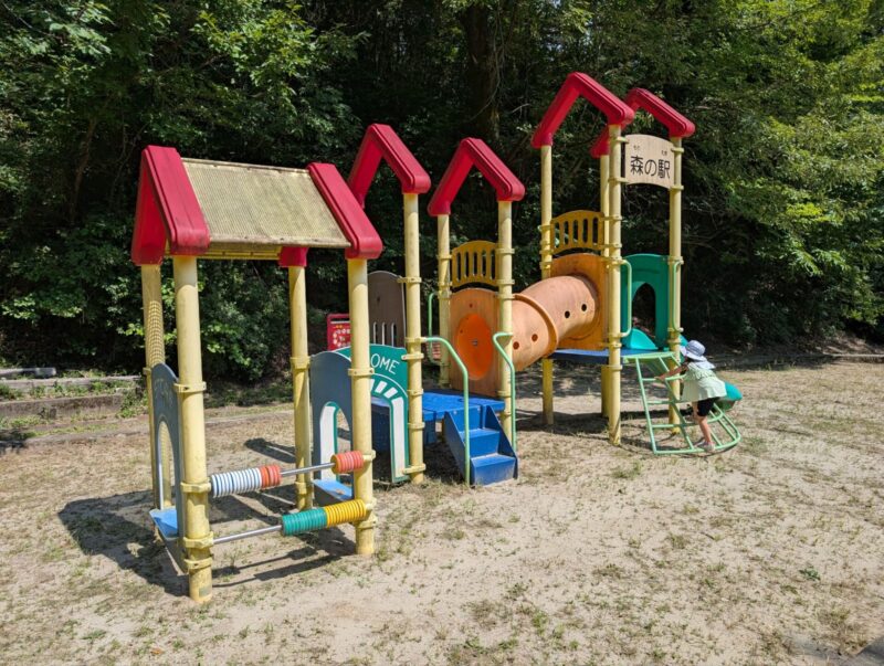 徒渉池の方に近づくともっと大きな遊具がたくさんありました。暑すぎて誰も遊んでいませんが、娘ちゃんは楽しそうに遊んでいます。
